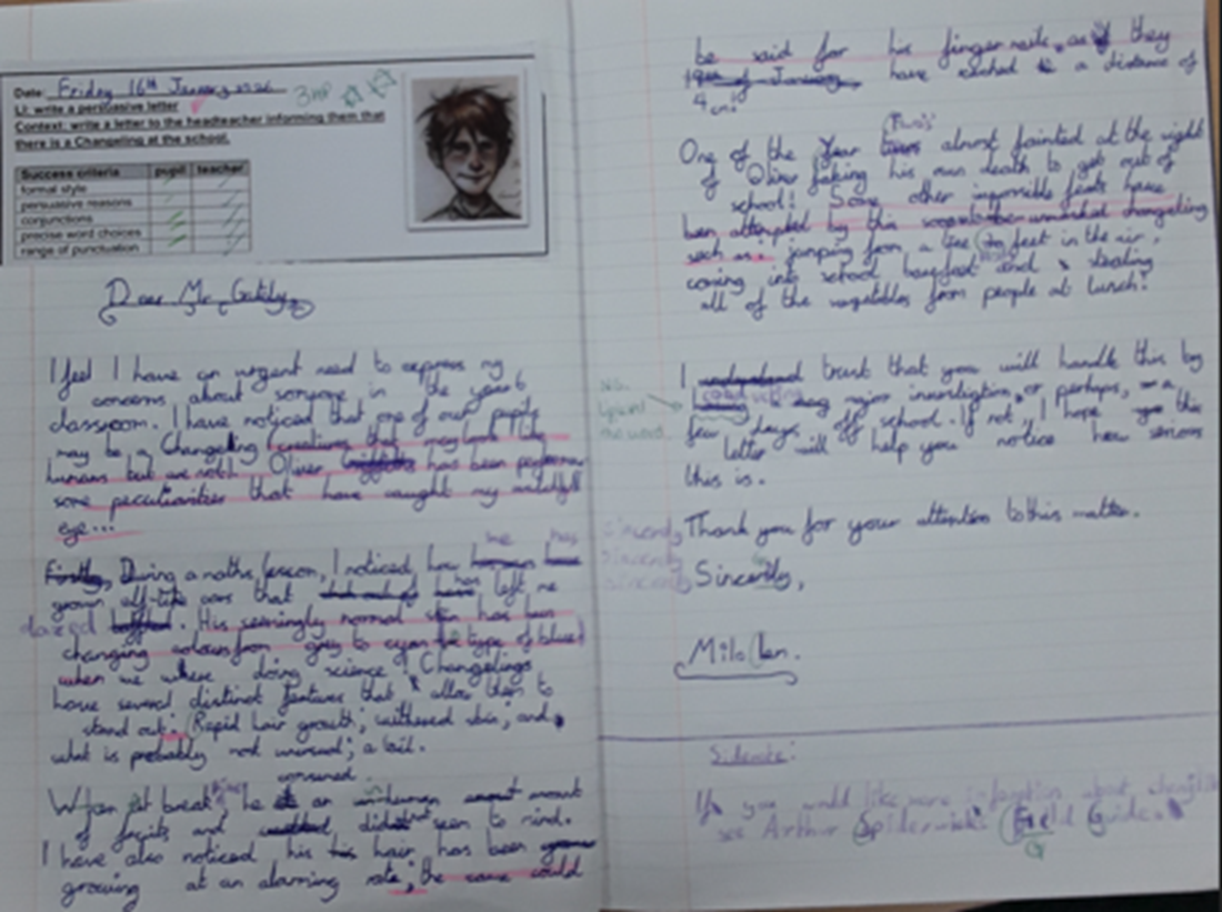This week in Literacy, we have read about a new creature which shape-shifts into children called ‘Changelings’ from ‘Arthur Spiderwick’s Field Guide to the Fantastical World Around You.’ The children realised there is a ‘Changeling’ in our class and wrote a letter to Mr Gately to persuade him to take action as this creature is dangerous and a threat to Two Waters School.