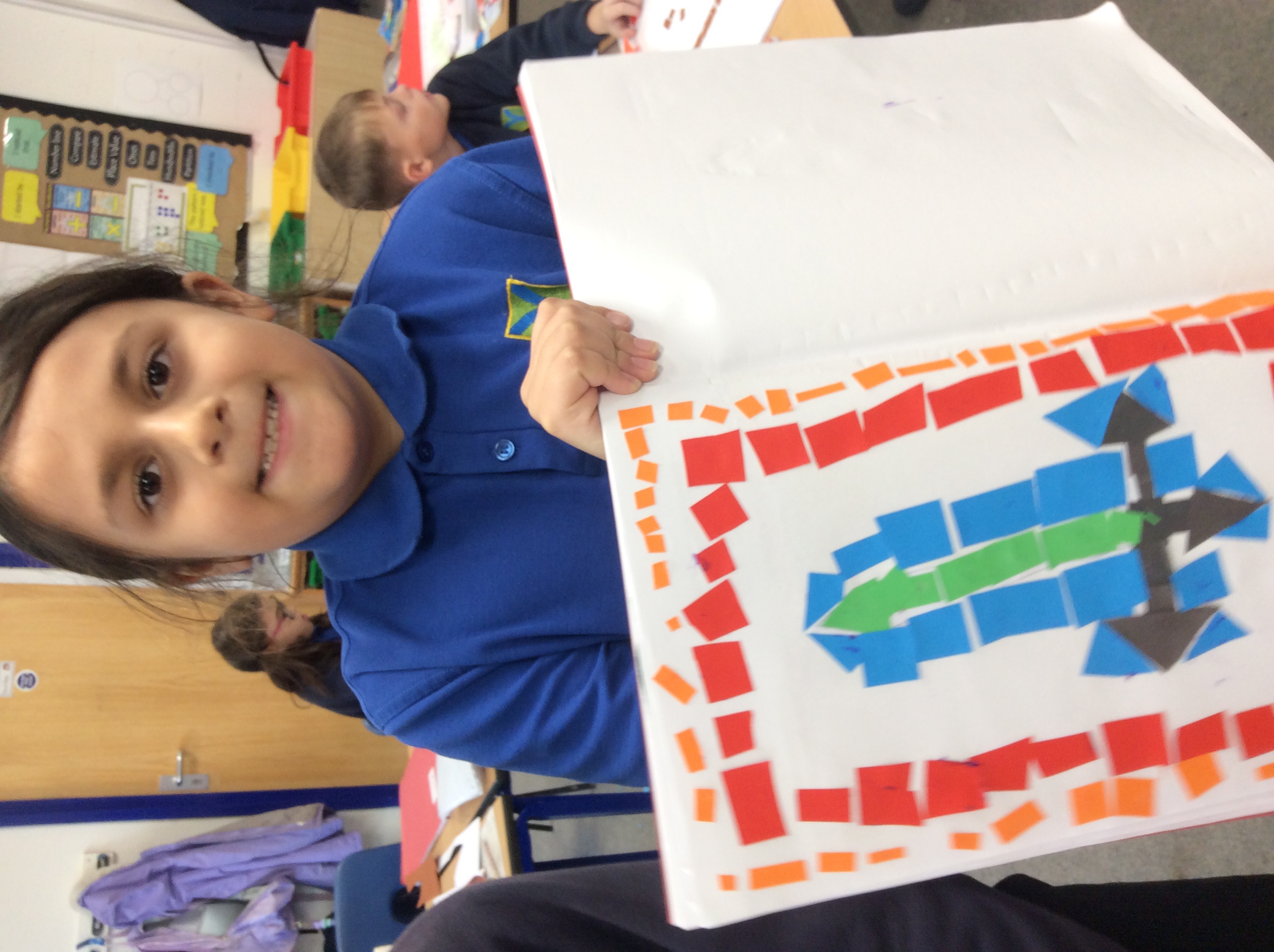 Next, we planned our designs. Some of us created Roman shields, flowers, some made patterns, and others designed Roman soldiers or animals. We thought carefully about our colours and patterns before sticking them down.