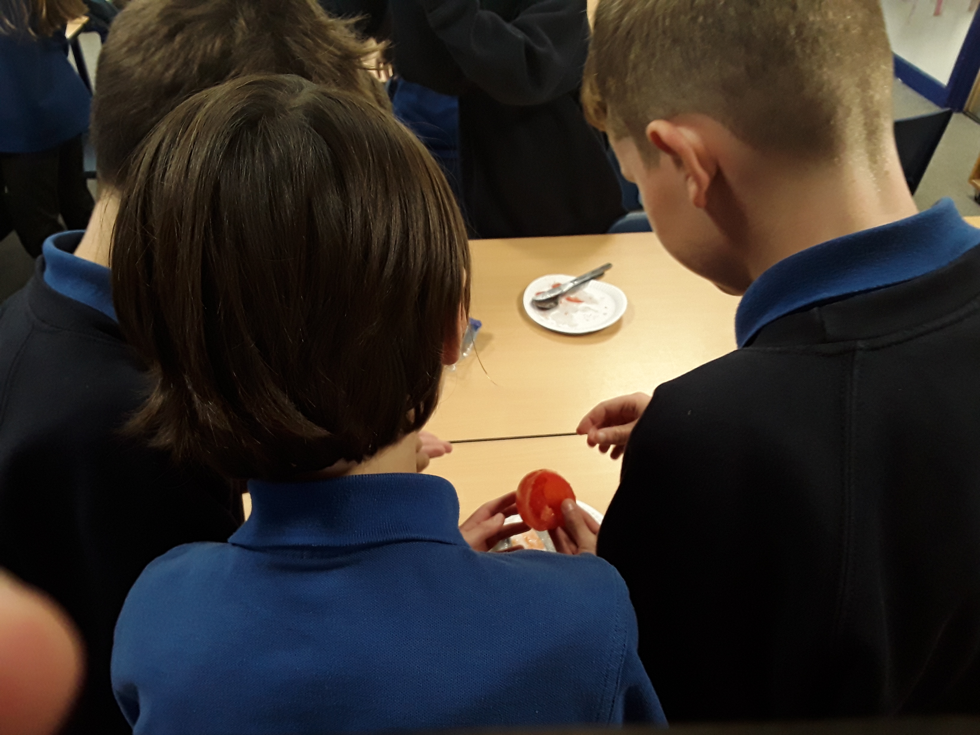 In groups, we began the process of mummifying a tomato. Firstly, we cut open the tomato (body) and scooped out the seeds (organs!). Afterward, we rinsed the tomato, rubbed salt all over it (Natron) and then wrapped it in our version of linen!