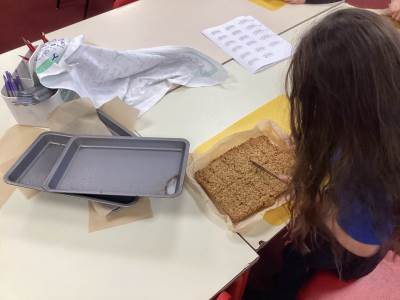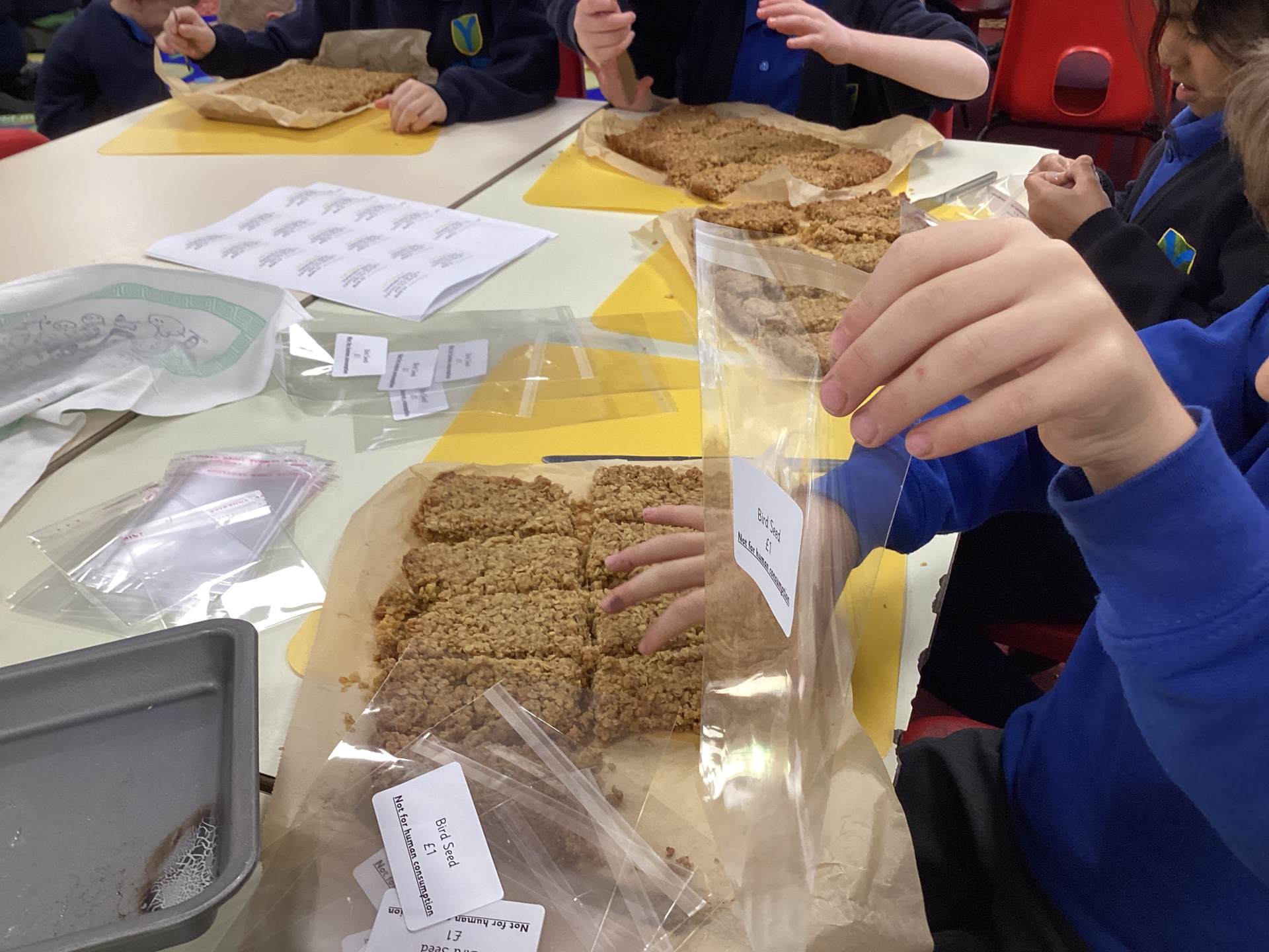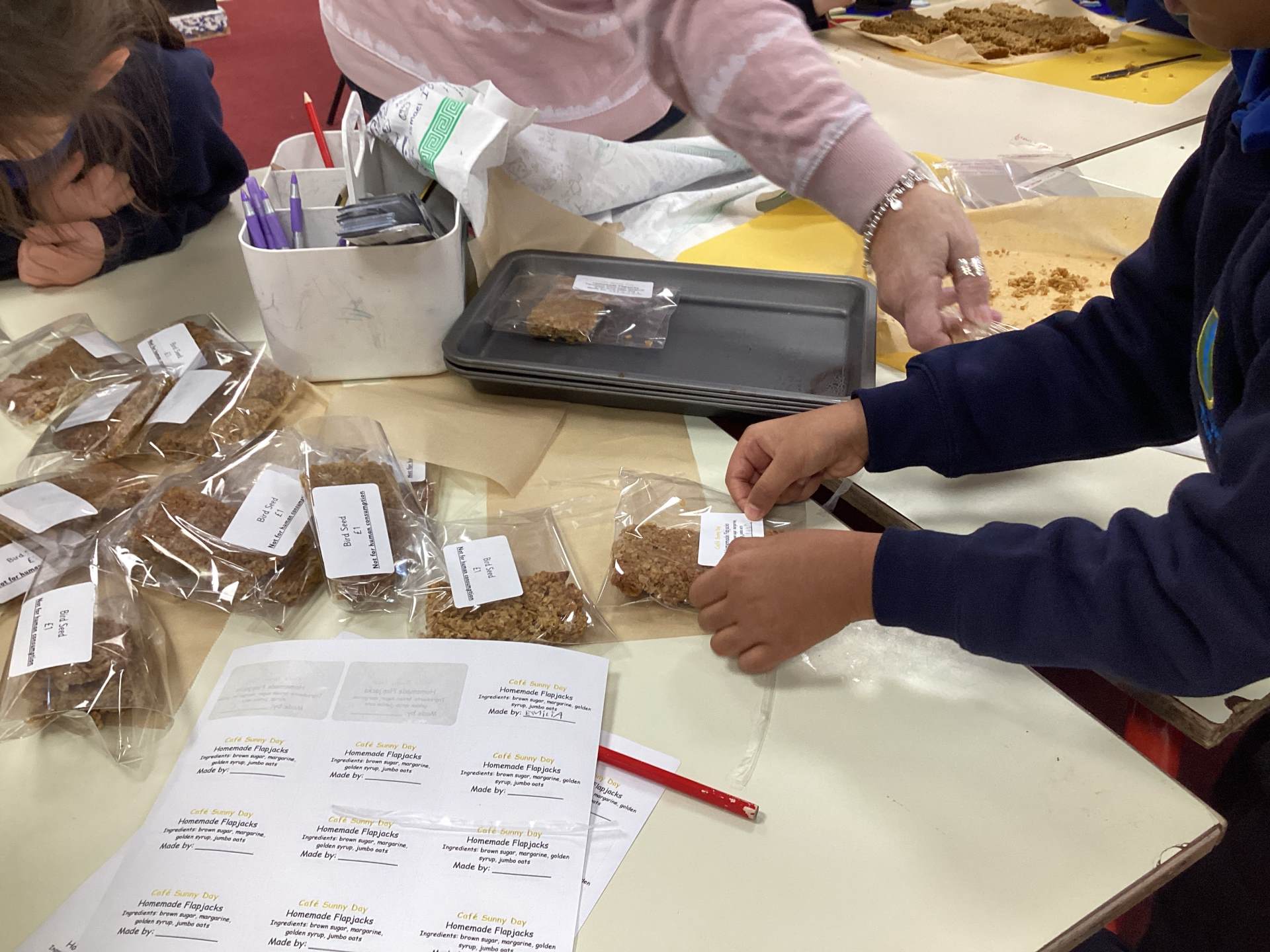 On Thursday, we carefully packaged and labelled all the flapjacks, ready for selling on Friday. Then came the big moment… Had the children saved enough money for the movie? Yes, they had! Since they resisted spending their pot earlier in the week, we enjoyed a lovely class movie with popcorn and juice before lunch.