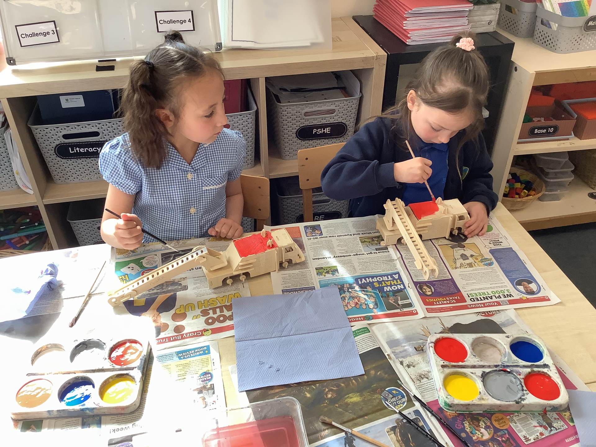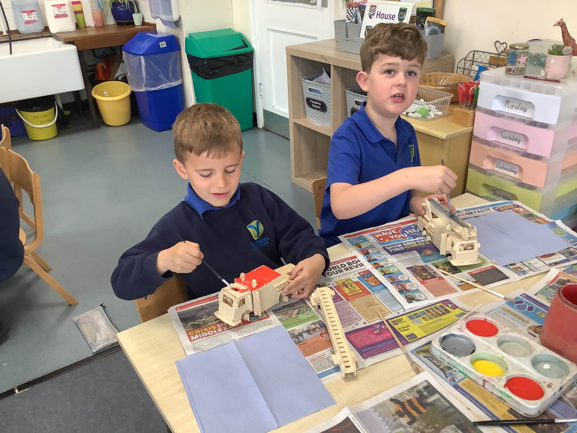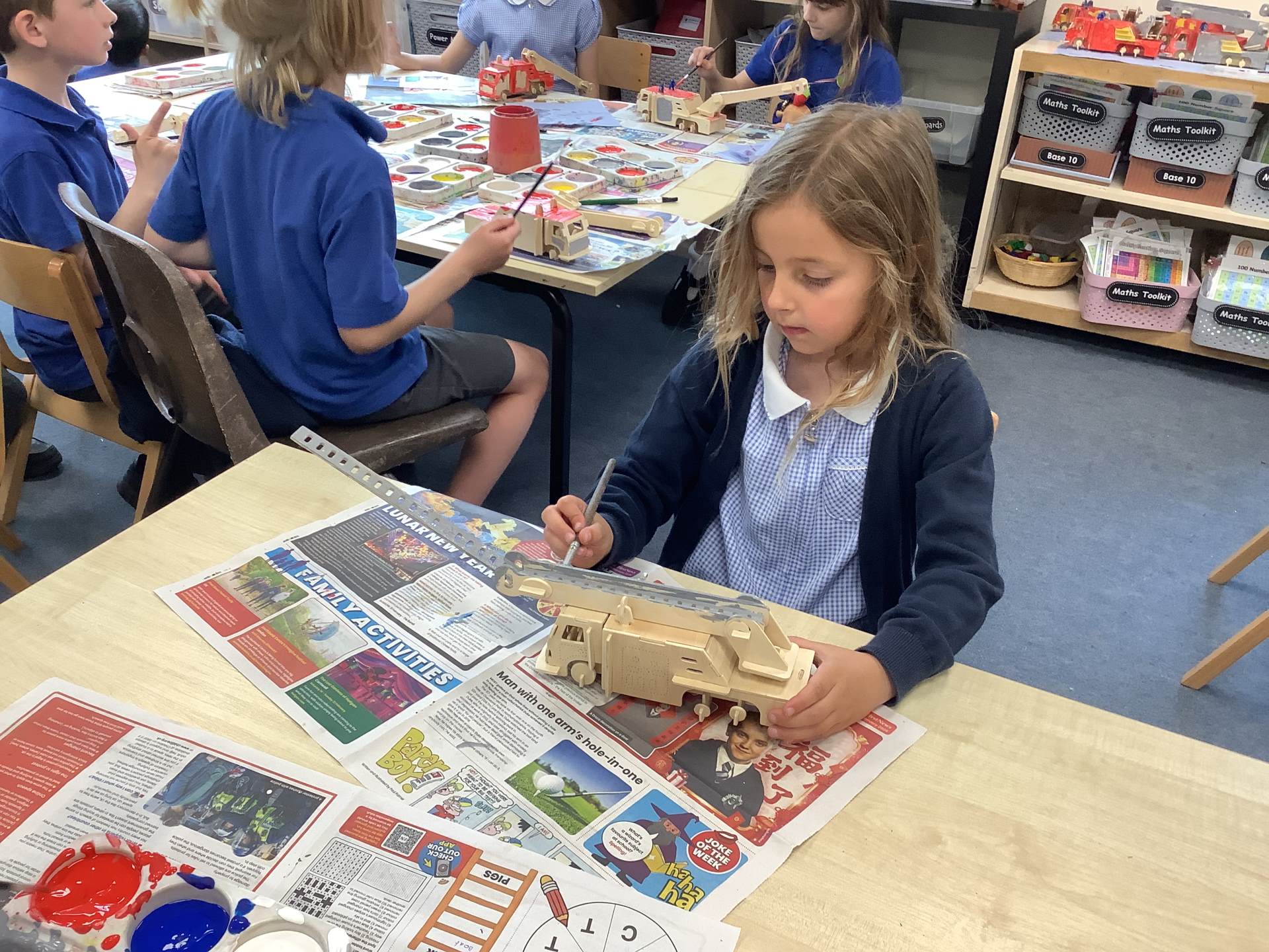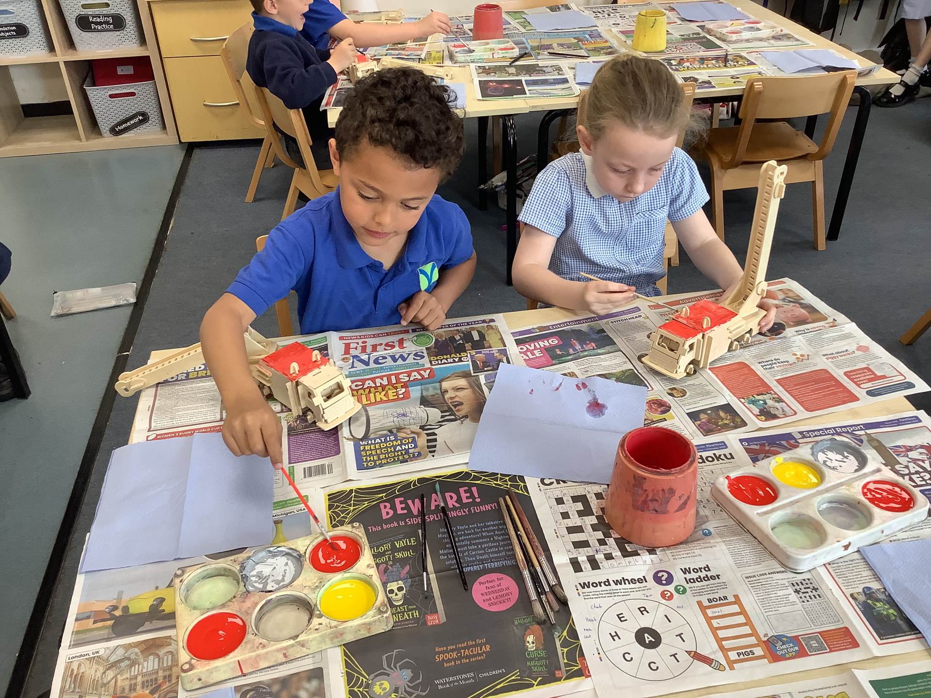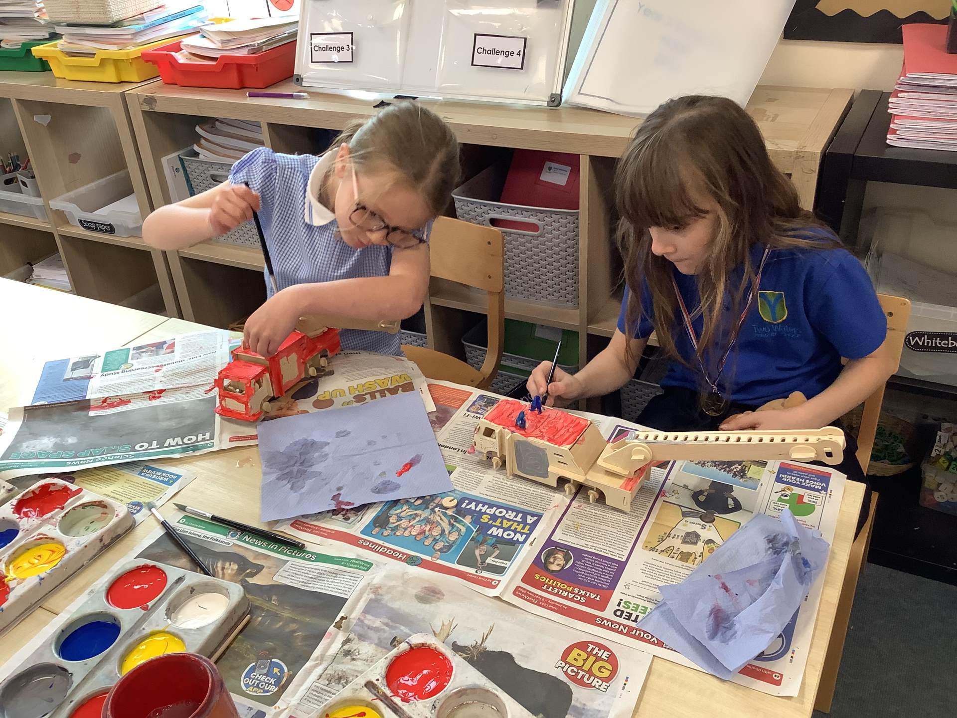 Later in the week, we turned our focus to Design and Technology, where the children worked incredibly hard to build their own fire engine models out of wood. They carefully joined the pieces together and even created working pivots so that the ladders could move, just like on real fire engines. To finish their projects, they painted their models with great attention to detail, making them look truly realistic.